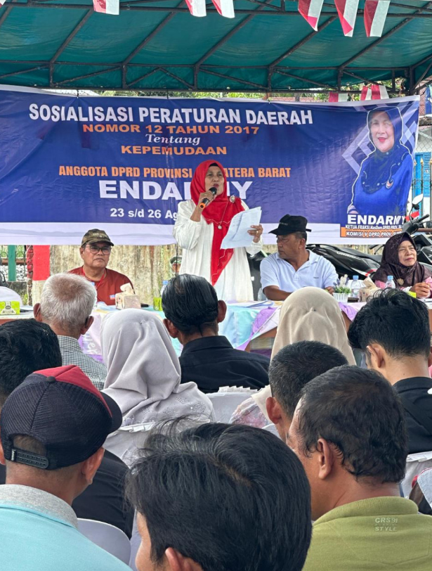 Faktanusantaraemas.com.                                 Padang (Sumbar).                                                             Anggota Komisi V DPRD Provinsi Sumatera Barat (Sumbar), Endarmy, menggelar sosialisasi Peraturan Daerah (Perda) Nomor 12 Tahun 2017 tentang Kepemudaan, Senin (25/8/2025). Dalam kesempatan itu, ia mengingatkan generasi muda agar menjauhi segala bentuk perbuatan yang merugikan diri sendiri maupun orang lain, karena bisa berujung pada ranah hukum.