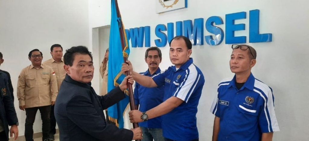 Ketua PWI OKU Yudi Saputra, SH didampingi Sekretaris Imam Nuryadin, SHi dan bendahara PWI OKU Eduar Syamsuri, SH Saat Menerima Bendera Pataka dari Ketua PWI Sumsel Kurnaidi, ST