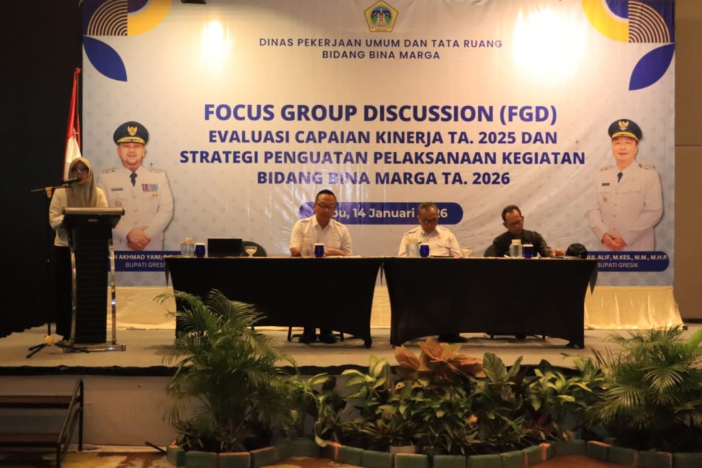 Wakil Bupati Gresik Asluchul Alif membuka Rapat Evaluasi Capaian Kinerja Dinas Pekerjaan Umum dan Tata Ruang (PUTR) Kabupaten Gresik yang digelar di Hotel Aston Gresik, Rabu (14/1/26). Dalam sambutannya, Wabup Alif menegaskan keseriusan Pemkab Gresik dalam membenahi infrastruktur jalan sebagai tulang punggung mobilitas dan penggerak roda perekonomian daerah.