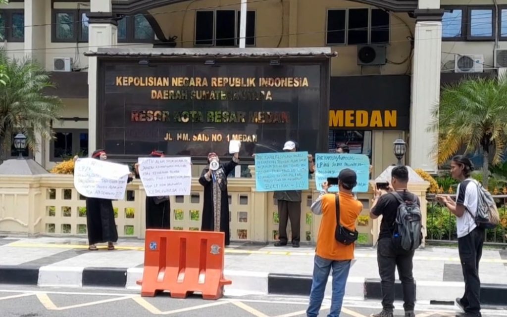 Sembari membawa sejumlah poster yang meminta perhatian Kapolda dan Wakapolrestabes Medan terhadap penyidik Alam Surya Wijaya, yang diduga memiliki “sesuatu” dengan pelapor, Fahril Fauzi Lubis, sehingga terjadi kriminalisasi terhadap terlapor berinisial MDL dan HBL.