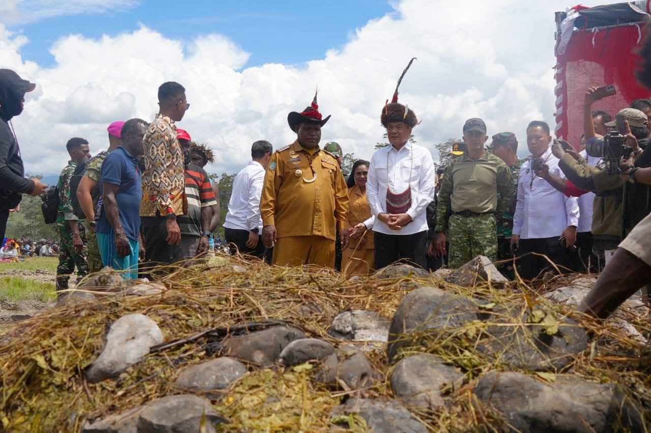 Papua Pegunungan, Polkam – Menteri Koordinator Bidang Politik dan Keamanan Republik Indonesia (Menko Polkam RI) Jenderal TNI (Purn) Djamari Chaniago menghadiri upacara bakar batu di Lapangan Openg Wesaput, Kabupaten Jayawijaya, Provinsi Papua Pegunungan, Selasa (2/12/2025). Dalam kesempatan tersebut, Djamari Chaniago juga diangkat menjadi warga kehormatan Papua Pegunungan.