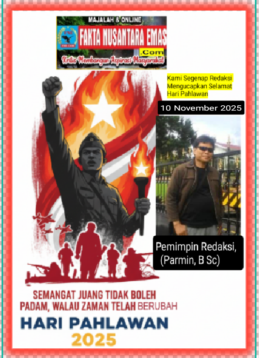 Kami Segenap Redaksi FNE.C Mengucapkan Selamat Hari Pahlawan Tahun 2025 9 November 202511 November 2025oleh Redaksi FNE-536 Dilihatoleh Redaksi FNE Faktanusantaraemas.com. Baturaja OKU (Sumsel). (9/11/2025). (*Tr.4_*). Post Views: 536 Jangan LewatkanAliran Sungai Menyempit, Eceng Gondok Di Terate–Belanti Segera DibersihkanPendekatan Agama Efektif Tumbuhkan Kepedulian Warga Terhadap LingkunganPKUB Kota Serang Gelar Kirab Dan Pentas Seni Budaya Lintas Iman Sambut Ramadan Dan ImlekKegiatan Pawai Tarhib Ramadhan 1447 H Digelar Wabup OKUPHMI Dan Keluarga Korban Kekerasan Resmi Melaporkan Oknum Guru HN Atas Dugaan Tindak Kekerasan Terhadap Siswi kelas 1 SDN 2 Pendopo