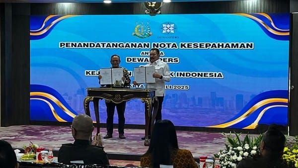 Penandatanganan MoU ini dilakukan di kompleks Kejaksaan Agung, Jakarta Selatan, Selasa (15/7), disaksikan langsung oleh Jaksa Agung ST Burhanuddin dan Ketua Dewan Pers Komaruddin Hidayat.