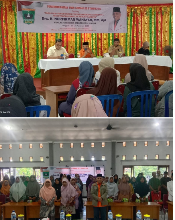 Faktanusantaraemas.com, Padang ( Sumbar). Wakil Ketua Komisi V Dewan Perwakilan Rakyat Daerah (DPRD) Provinsi Sumatera Barat Drs. H. Nurfirman Wansyah, A. Pt. MM melakukan sosialisasi Peraturan Daerah (Perda) nomor 9 tahun 2018 tentang Fasilitasi Pencegahan Penyalahgunaan Narkotika, Psikotropika dan Zat Adiktif (NAPZA) di Wisma Umi Kalsum, Kecamatan Sungai Pagu, Kabupaten Solok Selatan, Senin (25/8/2025).