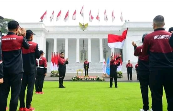 Presiden RI H.Joko Widodo, bertempat di halaman Istana Merdeka hari ini, melepas secara resmi kontingen Indonesia yang akan berlaga pada SEA Games ke-32 di Kamboja pada 5-17 Mei 2023.(2/5/2023).