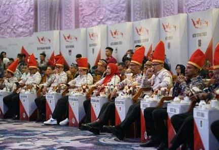 Pembukaan Rapat Kerja Nasional (Rakernas) XVI Asosiasi Pemerintah Kota Seluruh Indonesia (Apeksi) telah resmi dibuka di Upperhills Convention Center, Kota Makassar, Sulawesi Selatan, Rabu (12/7/2023).